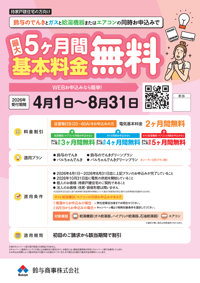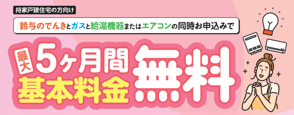鈴与のでんき従量電灯B(20~60A)をお申込みの方を対象に、基本料金が最大5ヶ月間無料になるキャンペーンを実施いたします。